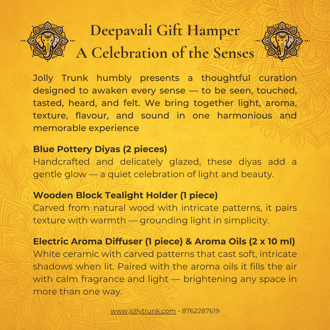 Carved from natural wood with intricate patterns, it pairs texture with warmth — grounding light in simplicity. - Electric Aroma Diffuser (1 piece) & Aroma Oils (2 x 10 ml)