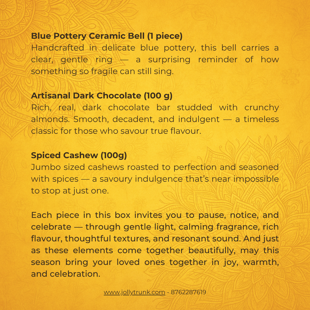 Handcrafted in delicate blue pottery, this bell carries a clear, gentle ring — a surprising reminder of how something so fragile can still sing. - Artisanal Dark Chocolate (100 g)